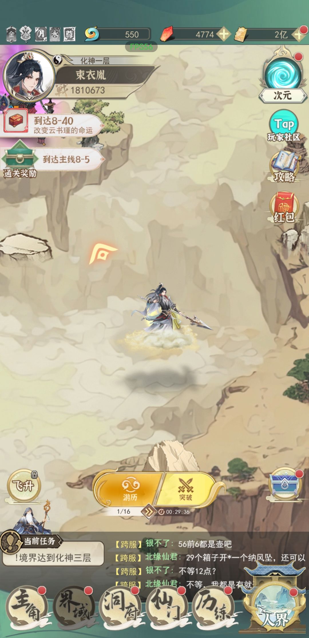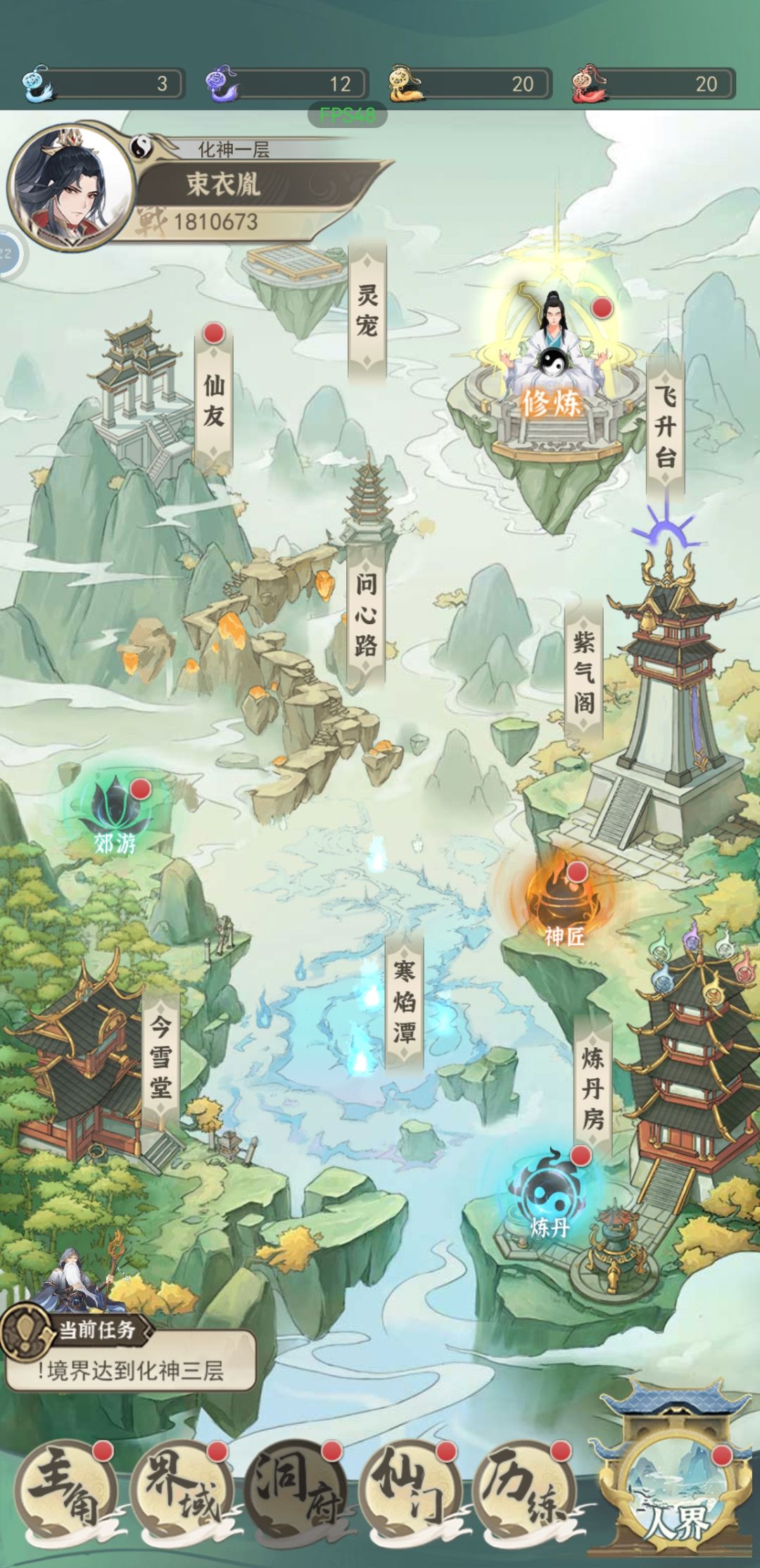 根据左下角当前任务提示一个个完成。游历越后面奖励越好,开局完成当前任务需要你完成的几十次即可,剩下的几十点体力可以等到元婴再一次花完。游历下方的>>表示快速游历,界域四解锁,我新人时期就没注意到这功能。