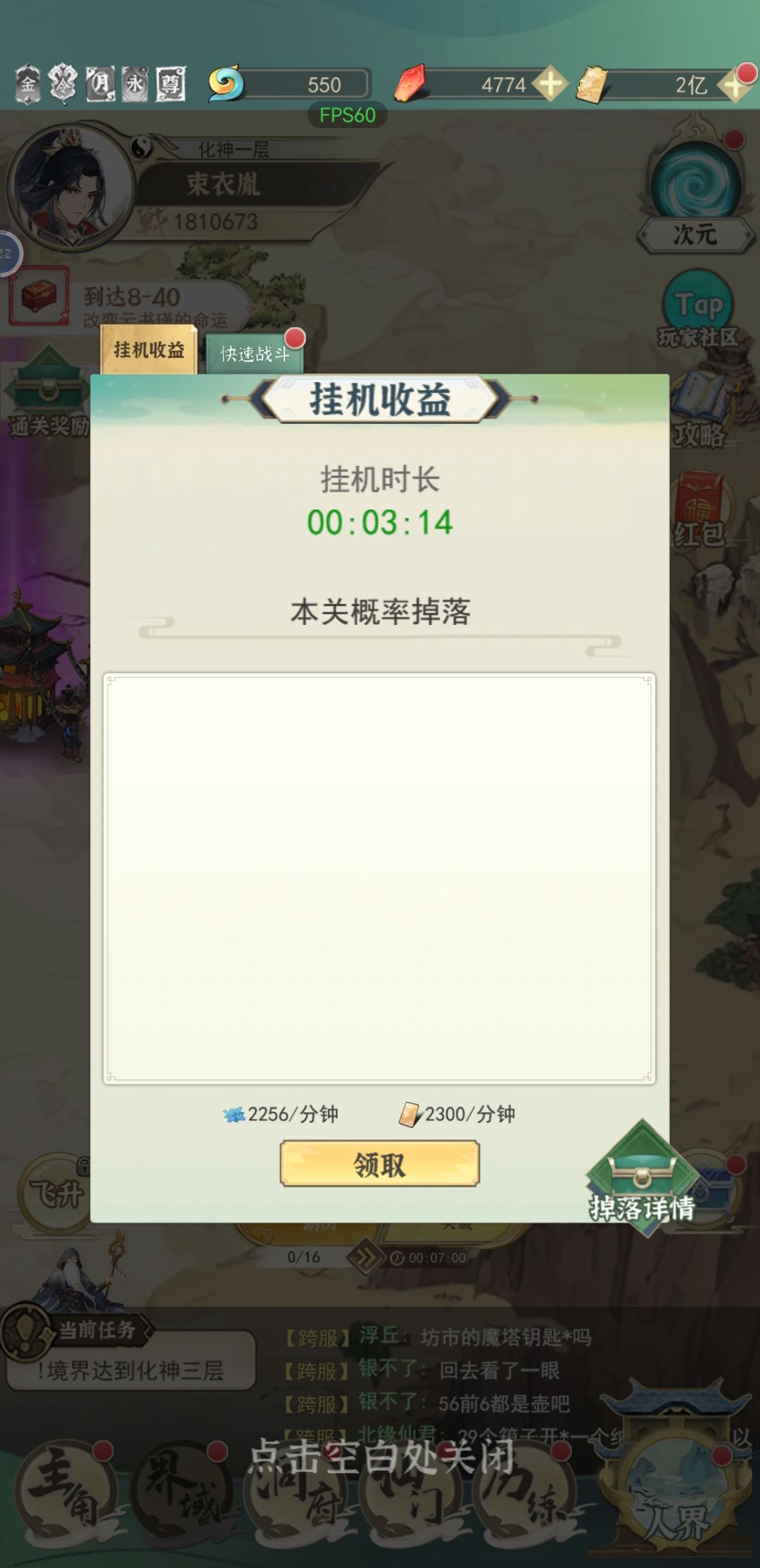 突破右边的箱子是挂机收益,卡修为升境界的时候可以领下当前收益。(基本这情况出现在筑基大圆满和金丹大圆满)还不够可以领快速战斗,直接领2小时挂机收益(2次免费,2次收费)。第一天尽量快点升元婴。