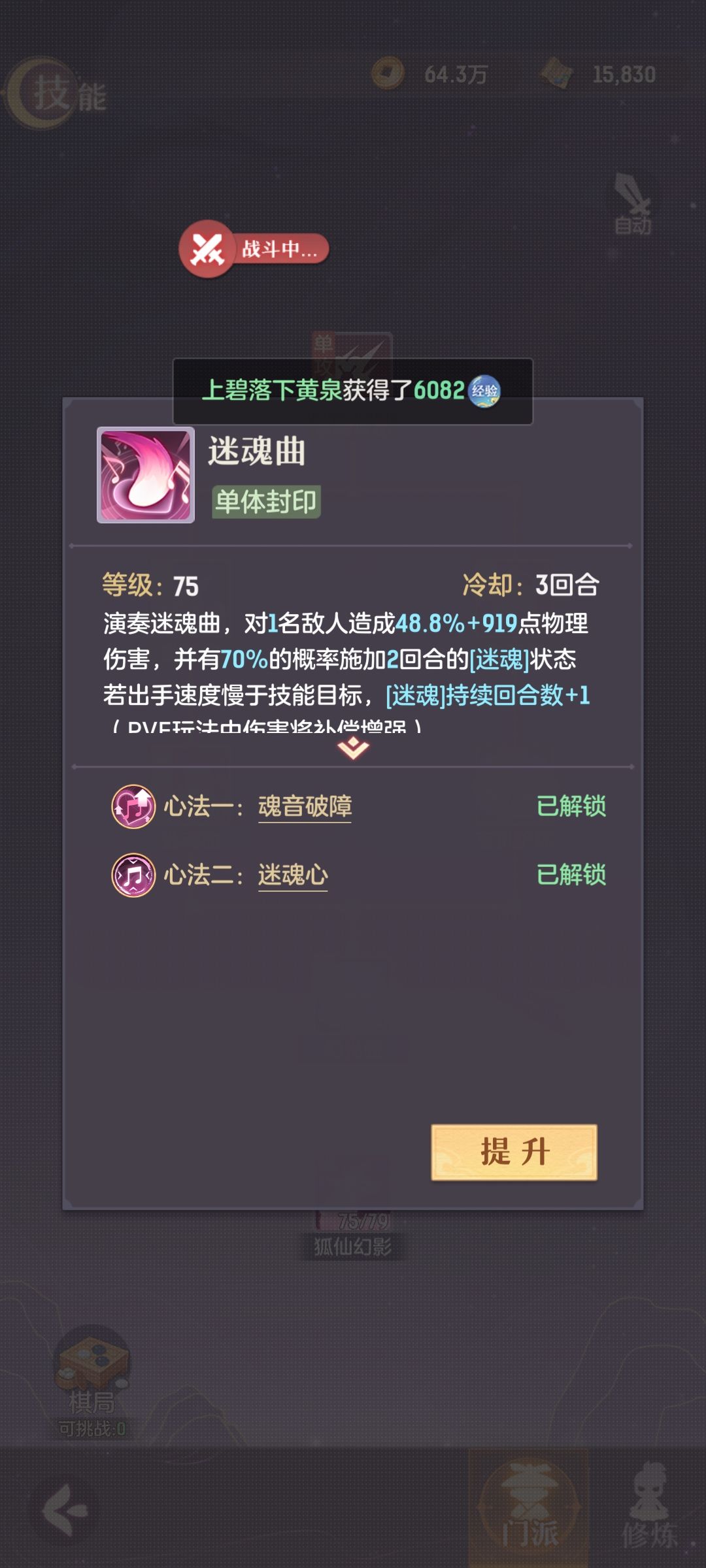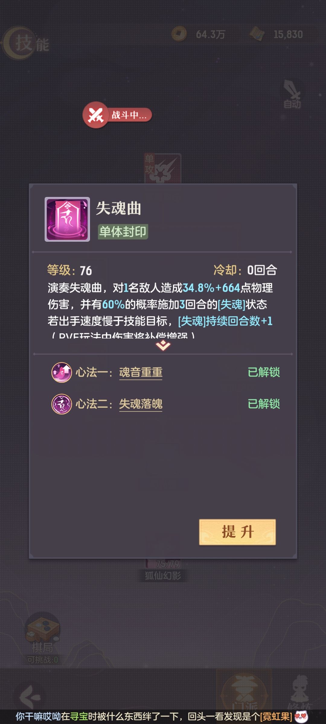 【失魂曲】和混乱的【迷魂曲】都只能作用于一个目标,虽说【真·失魂曲】有20%概率再噬魂另外一个目标,但是我实测下来,不单单是触发概率感人,并且他所谓的另外一个目标,抵挡率是高得离谱。我猜测和龙宫真技能多攻击更多目标会降低伤害一样,【真·失魂曲】也会降低此技能封印命中。这也是我65级以后就把这个真技能放进仓库吃灰的原因。
