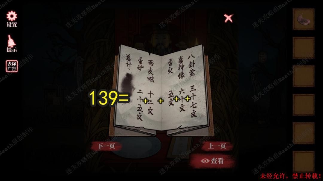 23、退出再进入场景,观察到短蜡烛上的字是“坟”,长蜡烛是“时”,最后点击下面的祭魂经,翻到最后一页,计算出所有物品的价值为139文。37 37.1