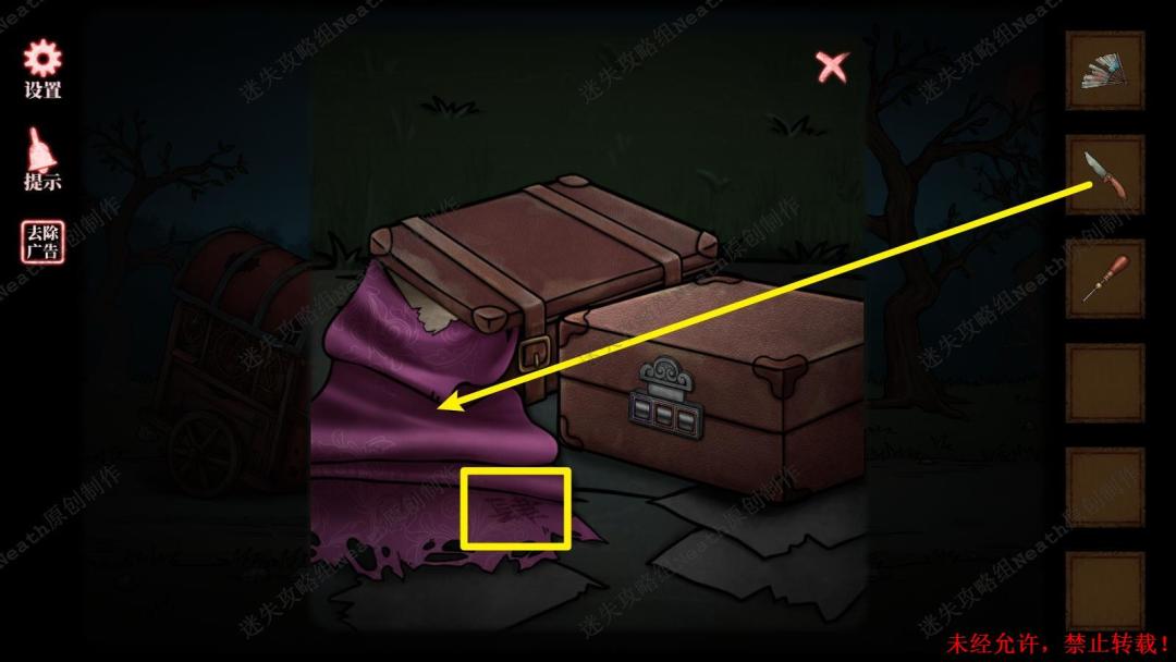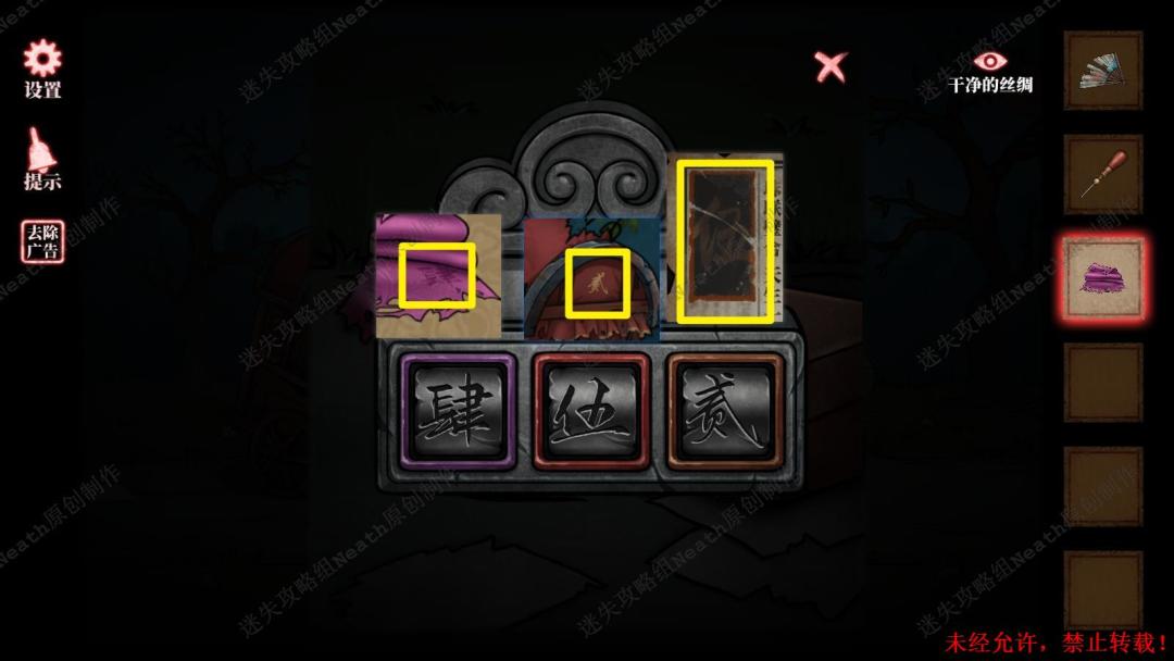 2、捡起地上的【铜锥子】,查看紫色的布,观察紫布上的数字肆,用【生锈的小刀】割下【干净的丝绸】。16 16.1