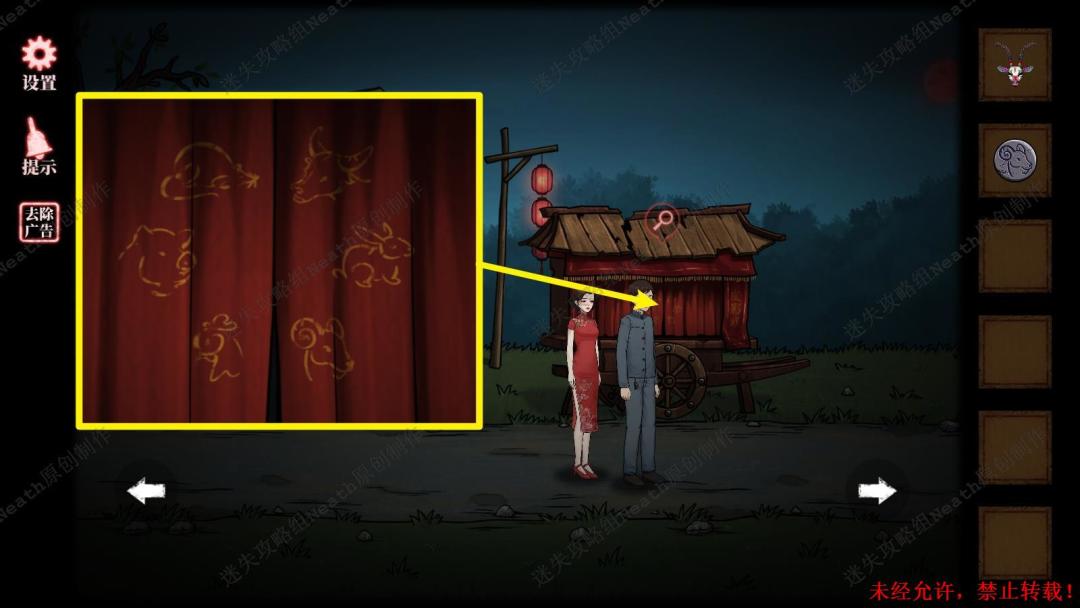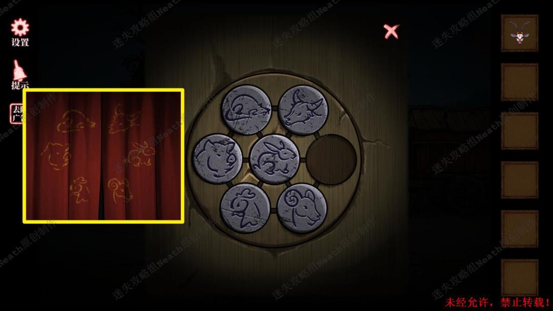 15、根据红布上的提示调整动物头像,点击头像可以把他移动到最近的空白处,如果中间空白有头像,则点击空白处起顺时针的第一个头像可以转动圆形轨道上的所有头像,完成后打开盒子拿走【戏票】。29
