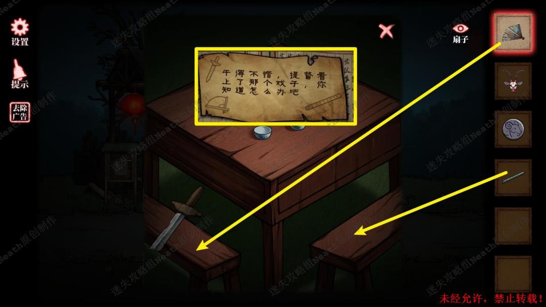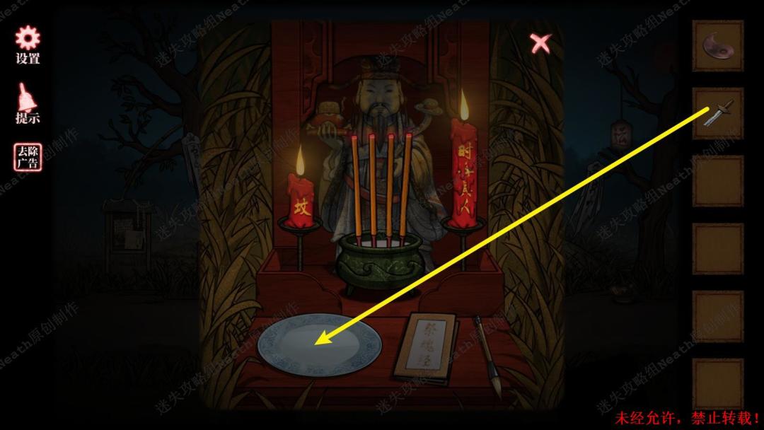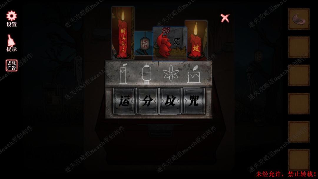 26、点击神龛右边的箱子,根据长短蜡烛,树上挂的灯笼,墓碑右下角的字,在密码锁上输入时运咒坟,打开箱子拿走【断剑】。40