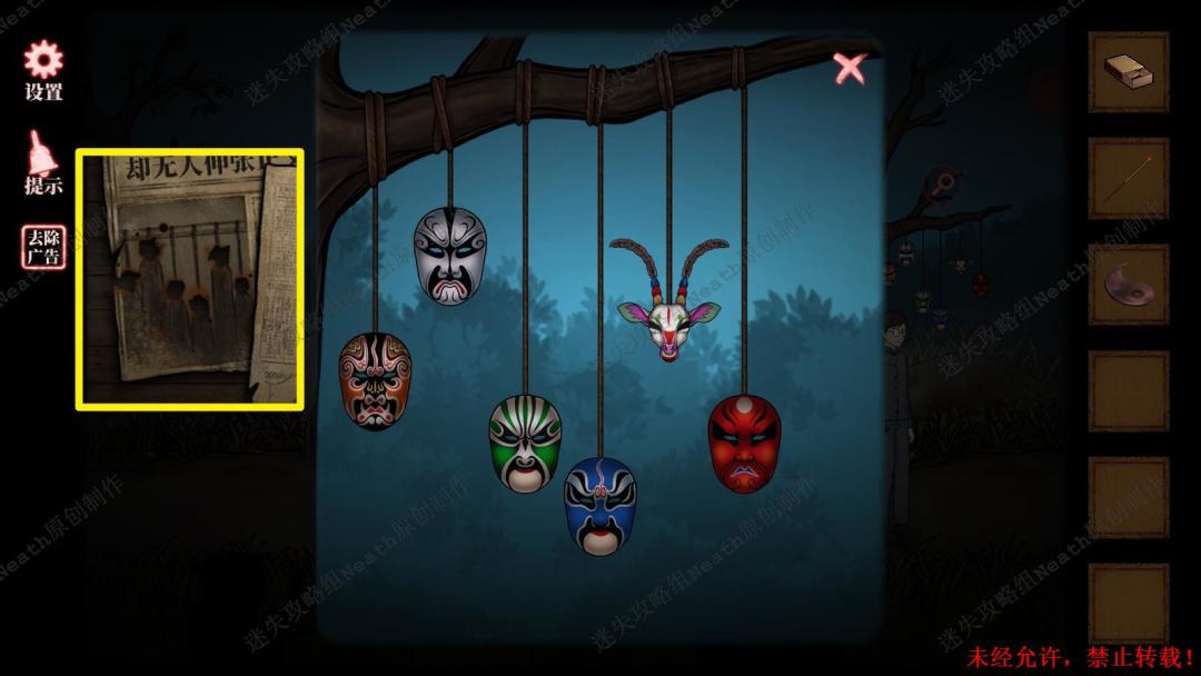 20、捡起火盆里的【一根香】,把【鹿脸面具】挂到右边树上的绳子上。34