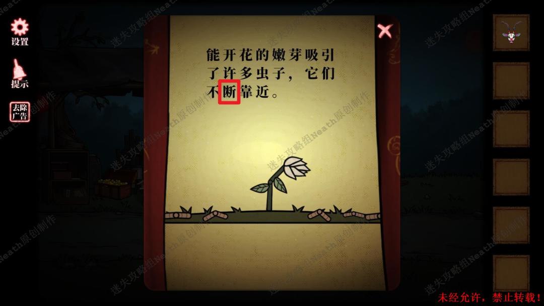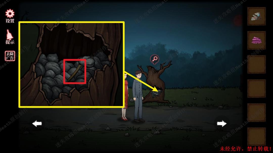 6、一直向右走,在树桩里翻开石头,拿走【树枝】。20