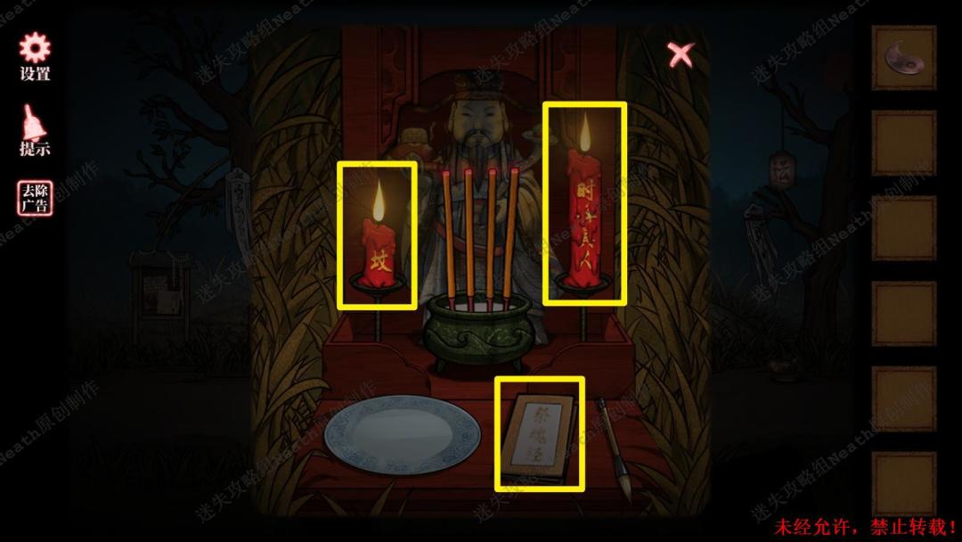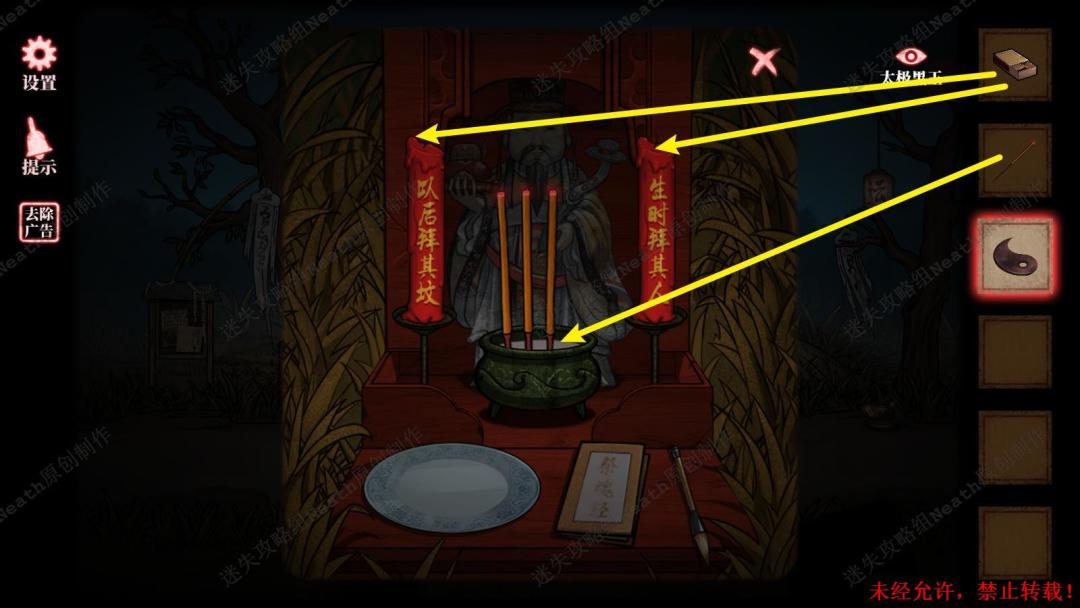 22、查看布告栏右边的神龛,给香炉插上【一根香】,用【火柴】点燃两根蜡烛。36 36.1