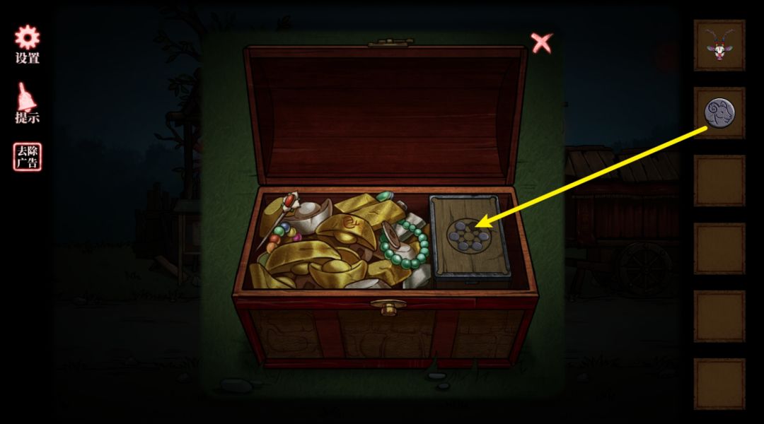 14、向左走,点击财宝箱,翻开右边的财宝,把【圆形金属片】放到木盒子上,进入小游戏。28 28.1