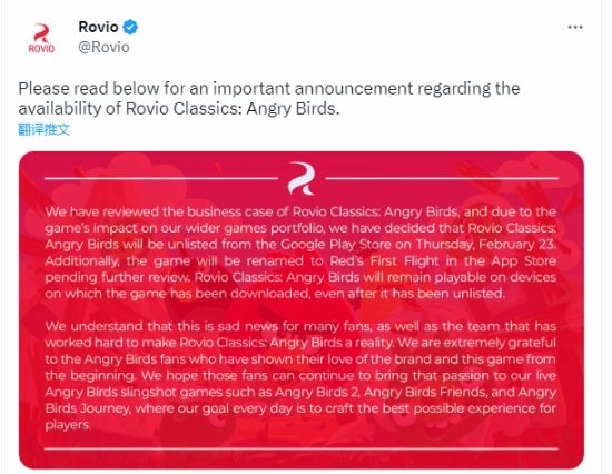 该作名为《愤怒的小鸟:经典版》是原作的重制版,也是目前在安卓和iOS上唯一的可玩版本。官方宣布将于2月23日从谷歌商店下架该作,已安装的可以继续游玩。目前,苹果商店的暂时不会下架,名称改为《Red's First Flight》。
