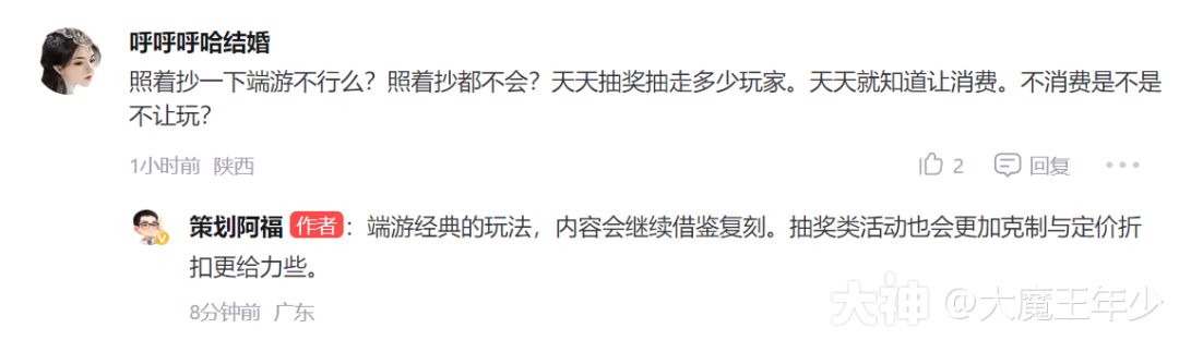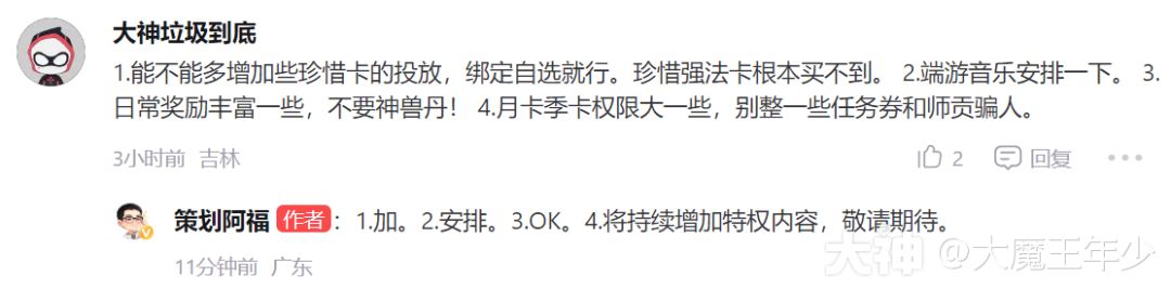 解读:这个问题其实很久了,策划的回复也有一定代表,也会进行一定改变,例如网易大神前面就有充值重置奖励等,但对于有奖励了,你让我去充没奖励的会很犹豫,希望策划在这个方面多考虑,合区能够全部重置奖励,那说明虽然工程大,但是还是可行的,不要对于这些问题就觉得亏了,或者现在给了以后没有,我觉得很多东西,进行一个规定,变成常态化,固定化,会让玩家觉得更加公平。