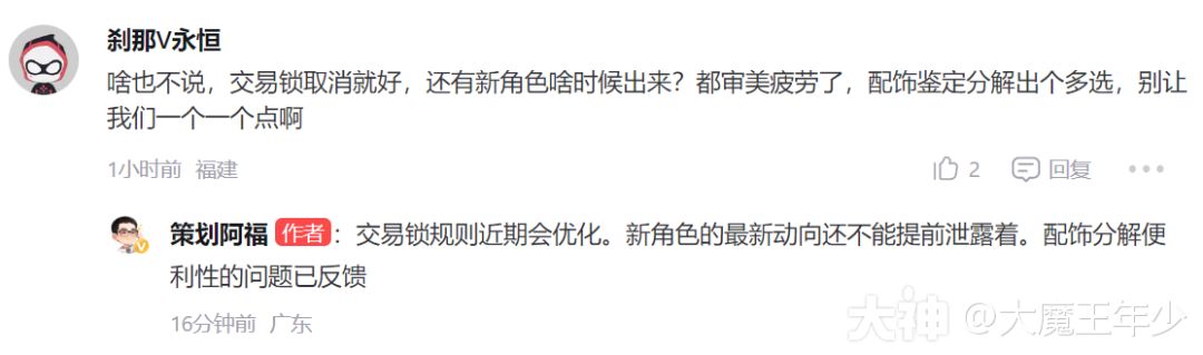 解读:这个问题看来,交易锁,是影响玩家的主要之一,优化也势在必行,我觉得策划在确定优化方案的同时,如果无法取消的情况下,可以让玩家把可行性说出来,策划组可以根据所有玩家意见给一个综合方案。
