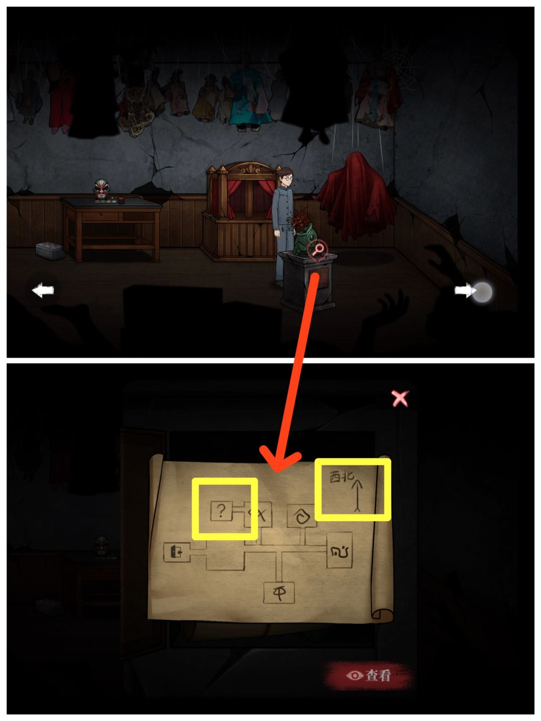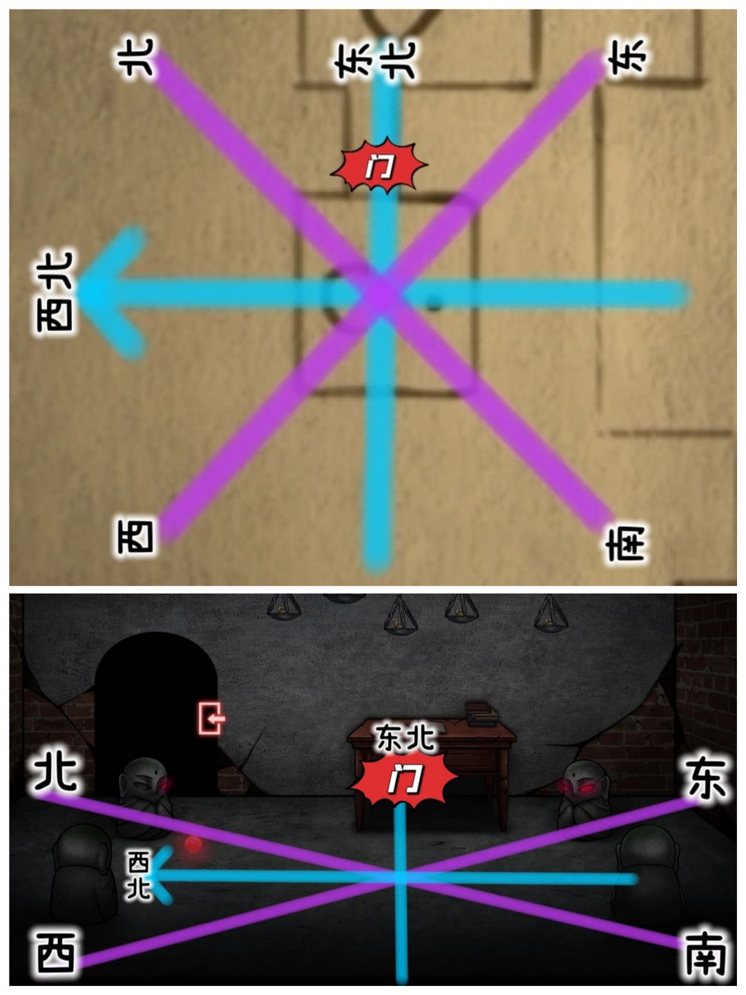 接着是石像,首先要确定这个房间的方位,大厅那个门,左上角的房间,里面有张地图,地图上说明了「上为西北」,观察地图上「?」的房间,对应到实际的密室,需要旋转一下视角,