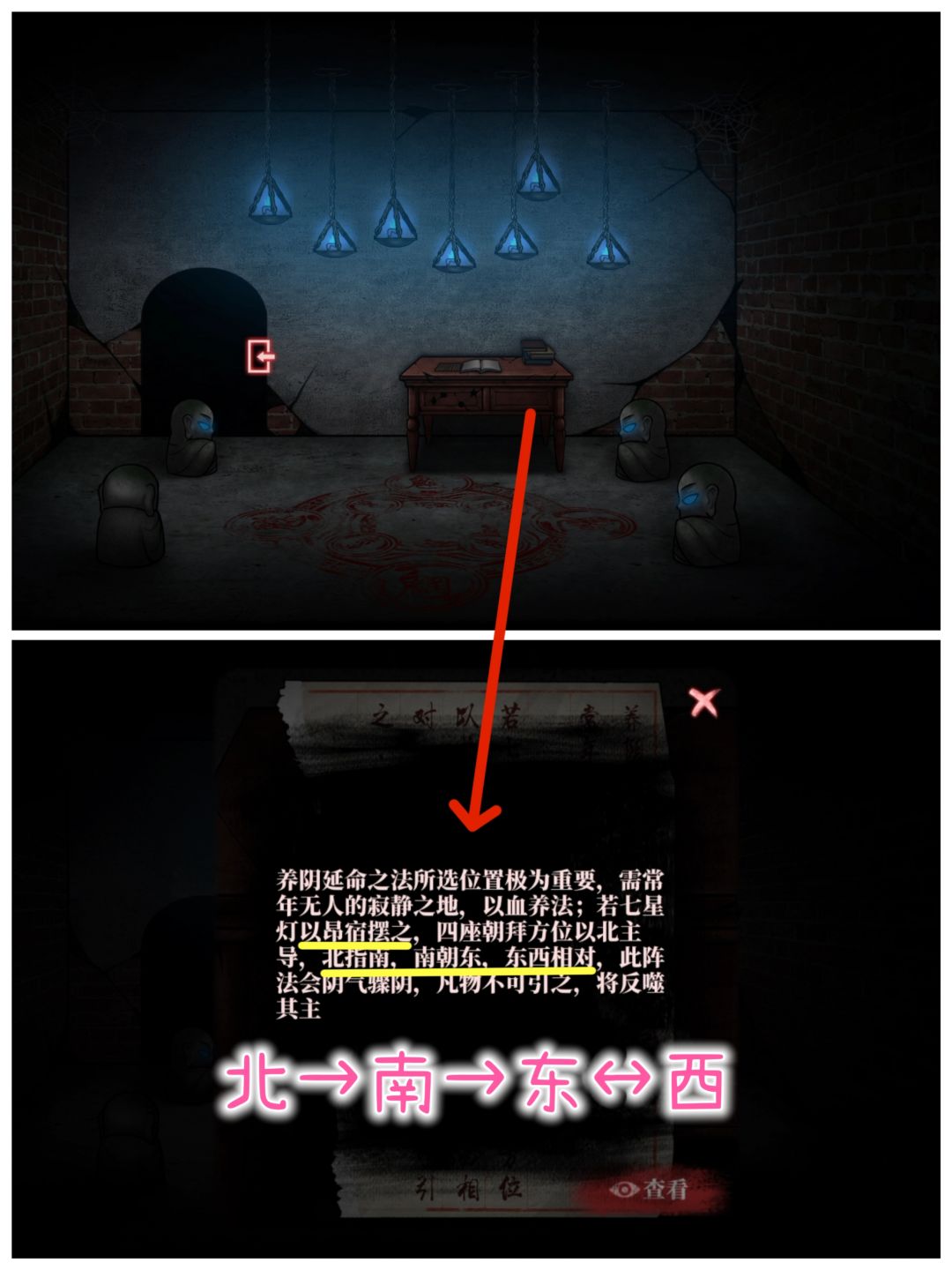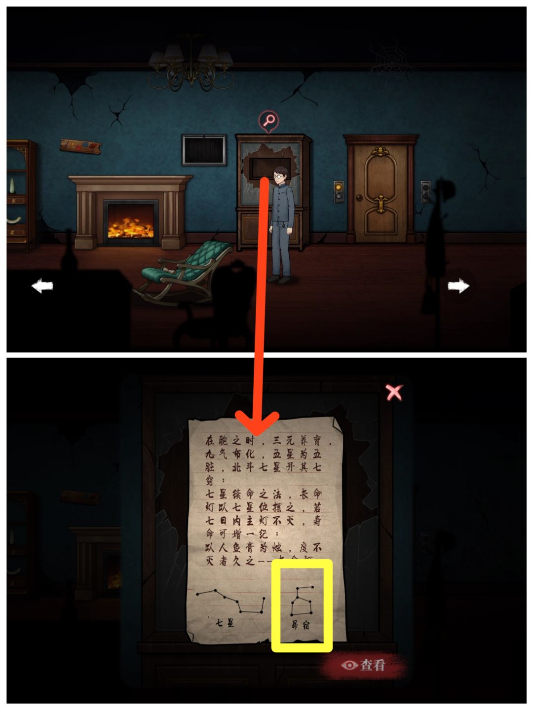 首先是七盏灯的摆放,大厅碎玻璃那里,有一张纸条,有星宿图案,根据图片调整密室七盏灯的位置,先确定大概位置,然后微调,如果光圈变得更大更亮,说明灯放对了位置。