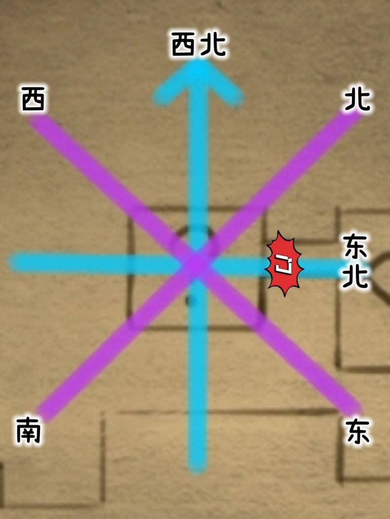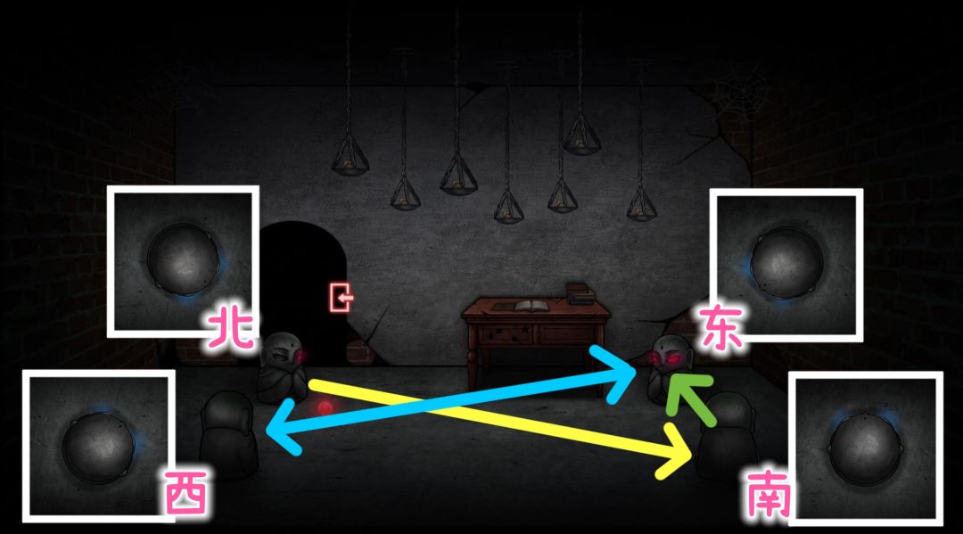 以我们玩家的视角看密室,左侧就是西北,根据上北下南左西右东,可以知道,【左上-北,左下-西,右上-东,右下-南】,也就是地上四个雕像代表的方位,最后根据【北↣南↣东⇔西】的要求旋转雕像即可。