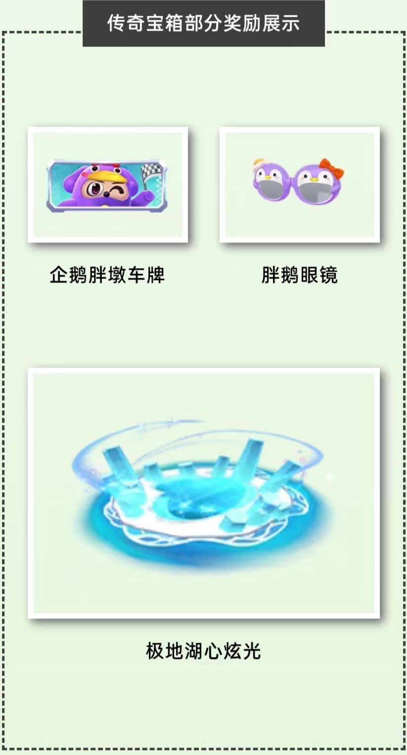 除了企鹅胖墩之外,本期宝箱内还有甜甜的突破糖果、极地湖心炫光、胖鹅眼镜、企鹅胖墩车牌、企鹅胖墩喷漆等超多好礼等着车友解锁!