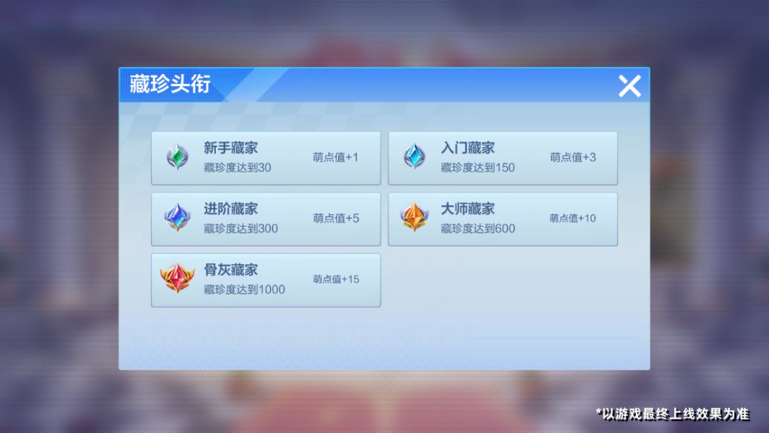 收集珍藏之物可获取对应的藏珍度,当藏珍度达到一定数值时,可获取不同的藏珍头衔,藏珍头衔将显示在车友的个人信息界面,同时藏珍头衔还可增加车友的萌点值哦~