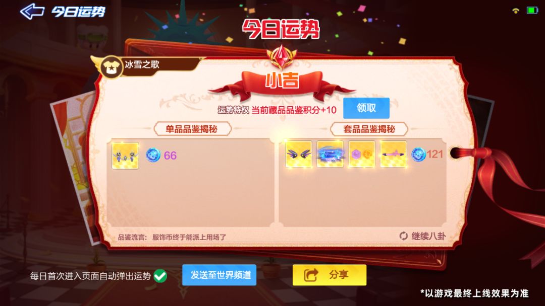 由于品鉴功能获取品鉴积分拥有不确定性,因此通过“每日运势”功能掌握更多品鉴资讯将尤为重要!每日首次选定珍藏之物进入页面时,会弹出“今日运势”界面,可以看到当日的鉴定积分揭秘资讯,按照资讯进行鉴定可以大幅度提升品鉴积分的获取效率!车友们可以随时点击右上角打开“今日运势”界面查看详情。此外,大家还可将自己的每日运势与其他玩家分享,通过运势分享可掌握更多品鉴资讯哦~