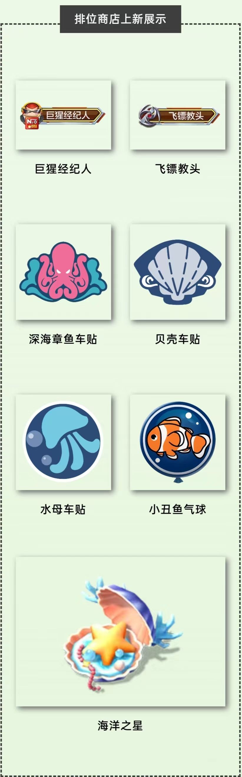 2月24日新赛季开启后,排位商店将上架全新赛季资源。赛季主题小屋建筑-海洋之星、深海章鱼车贴、贝壳车贴、水母车贴、小丑鱼气球,以及两枚防御特殊道具的史诗级称号巨猩经纪人、飞镖教头等你来拿!