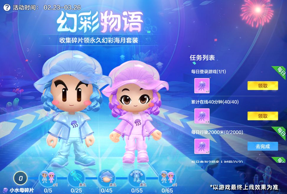 2月23日-3月26日,福利站将开启【幻彩物语】活动,活动期间车友们每日完成指定任务可收集小水母碎片,累计收集进度达标即可领取永久幻彩海月套装!皎洁的月光,终将照亮无尽黑暗的深海,绚丽多彩的海底景象必将重现天日~