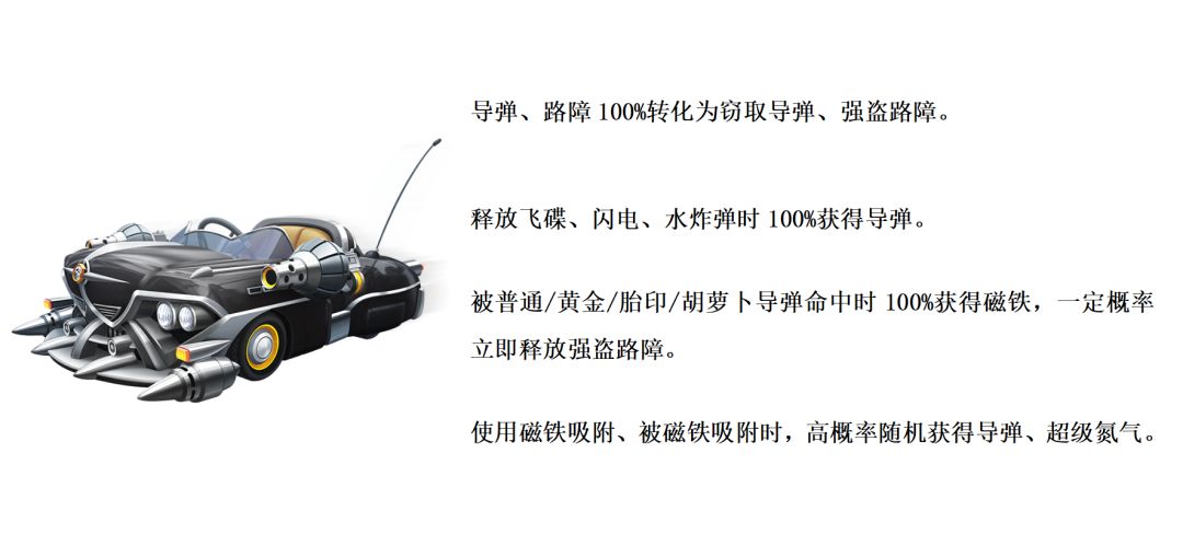 惊天枭雄搭载了全新道具窃取导弹:命中后目标被炸飞,并随机偷取目标持有的一个道具。强盗路障:在第一名前方落下路障,目标撞到后速度将会大幅降低,并随机抢夺目标持有的一个道具。惊天枭雄拥有极为强大的巧取豪夺能力,无论是能够精准针对敌方单点的窃取导弹,还是针对领跑赛车出其不意的强盗路障,在命中敌方赛车时都能将敌人手中的道具据为己有,提升自身的同时极大程度影响敌方道具节奏,堪称赛场上令人闻风丧胆的噩梦。