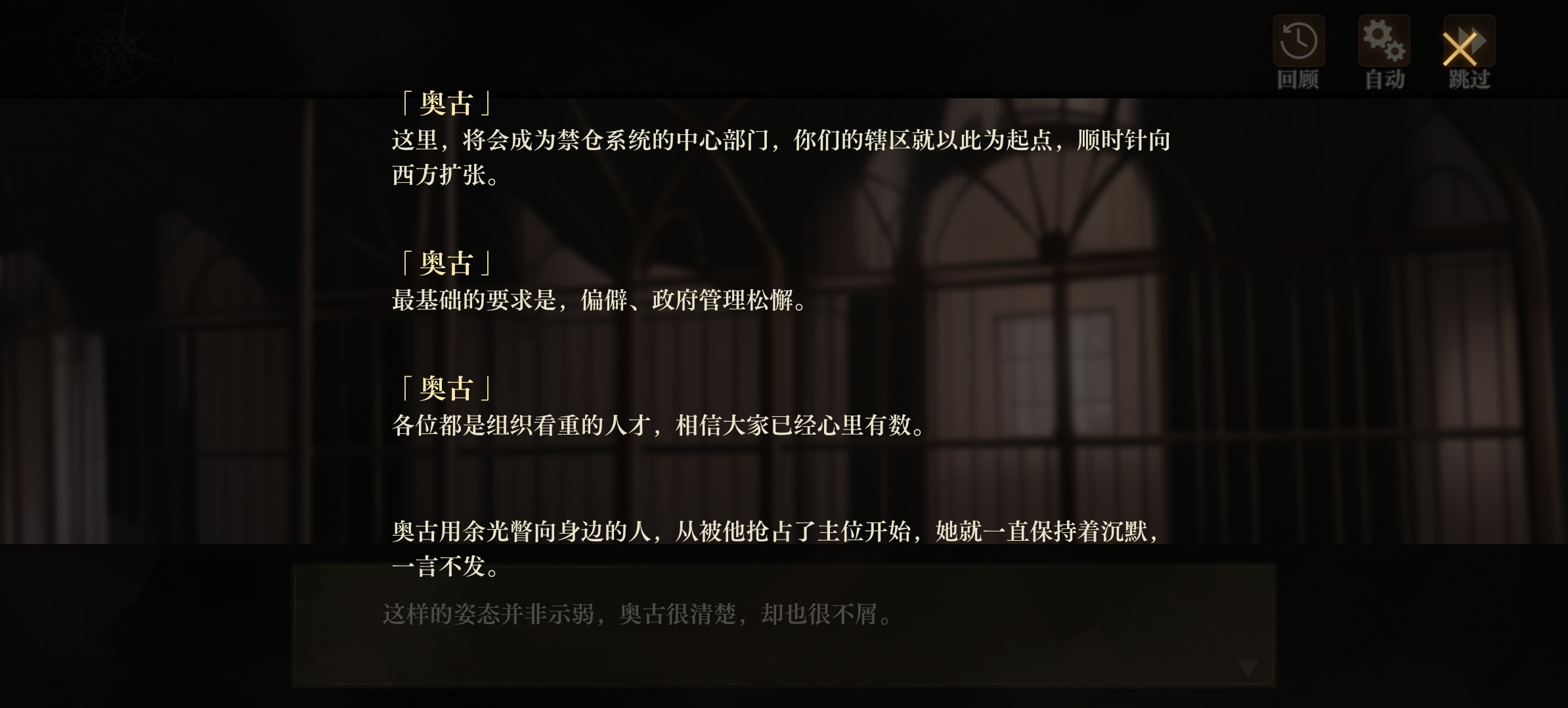 奥古被救走应该是多利安意料之中的情况。从秘书官的表述鸢尾应该是希望把裁决会驱出舒弗瑞兹的。但裁决会的作风滴水不漏,本土和裁决会的关系难以理清。靠一个星罗群岛总督的力量显然不太可能抓住裁决会的重要人物,多利安能做的只是继续等待时机。