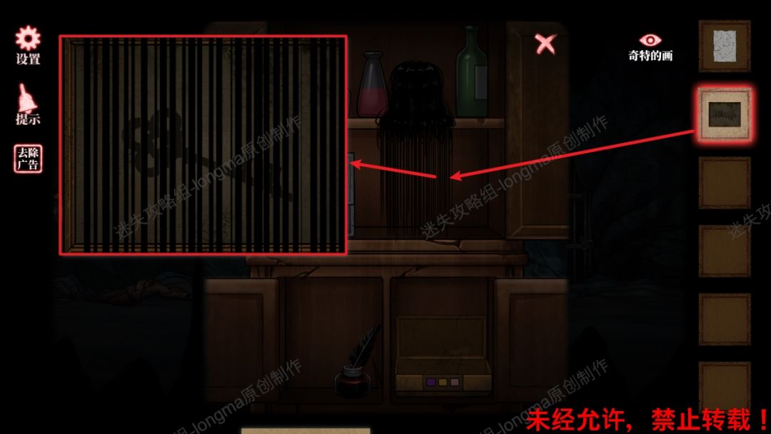 17.将【奇特的画】放在柜子中的头发下,左右拽动,直到出现最清楚的钥匙图形,获得【钥匙】。17