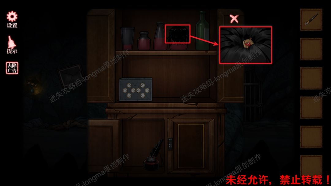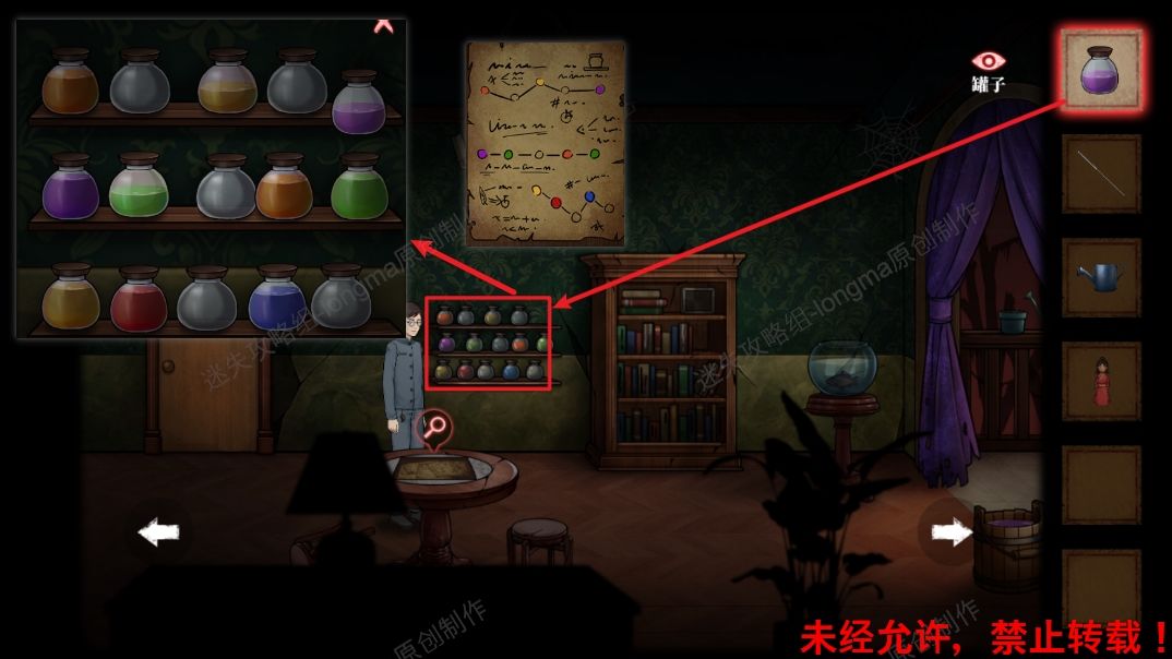 32.将【罐子】放入墙上的架子上,对照桌子上的线索纸,完成摆放,拾取掉落的【木质品】。32