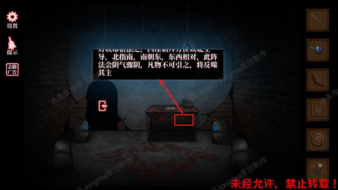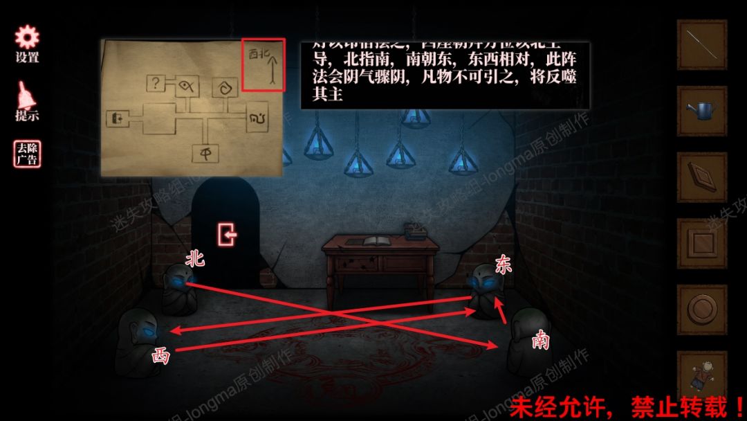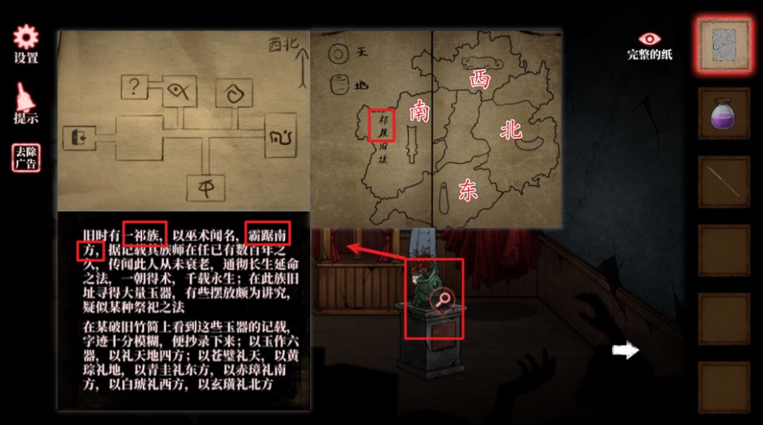 24.查看暗格中线索,纸张中的密室地图,书中祭祀地图,并根据书中记载找到祭祀地图的方位(文字记载中祁族在南方,根据地图规则“上北下南,左西右东”,南对应北,南左边是西,右边是东)。24