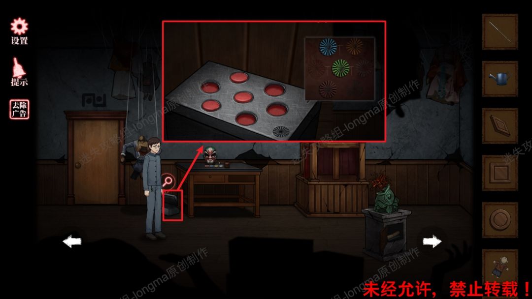 51.查看桌角箱子,对照风车图案,将四个没有风车位置的按钮按下去,打开盒子获得【一袋种子】【细线】。51