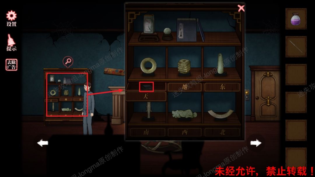 25.退出屋子,来到客厅,对照上面的线索,调整架子上的玉器位置(如图25),获得【方盒】。25