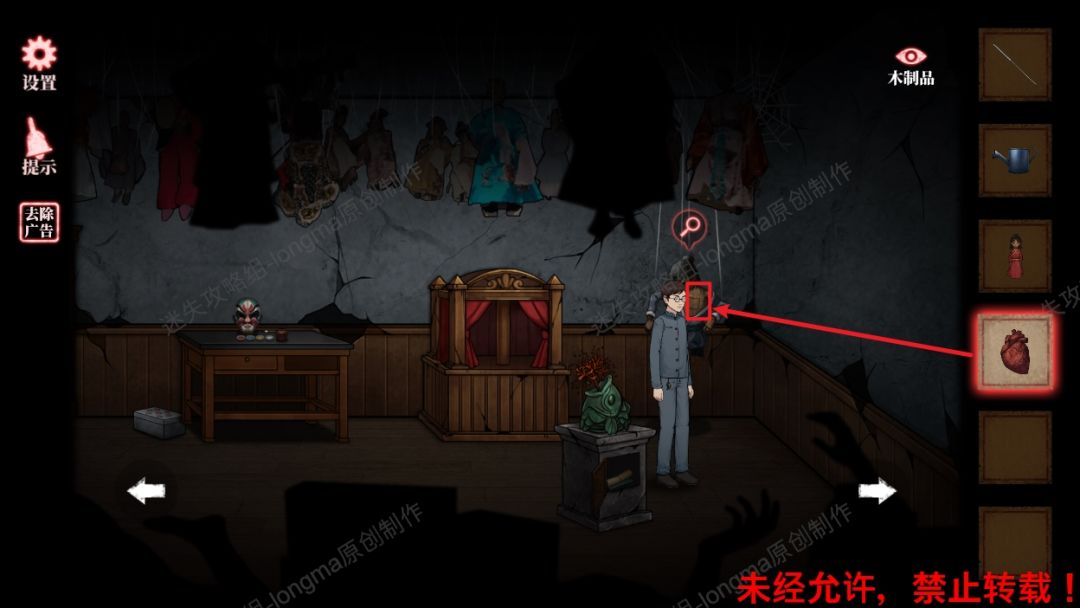 34.撤下最右边的红布,将【木制品】放入木偶胸口,获得【一块木牌】。34