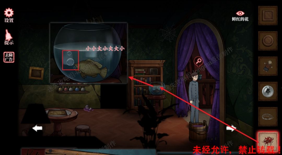 56.将【鲜红的花】放入鱼缸中,记住吐泡泡的大小“小小大小大大小”。56