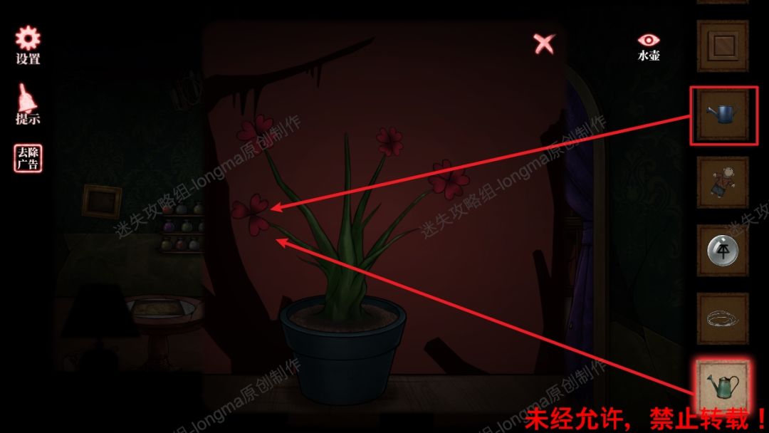54.退出特写场景,再次点击进入花盆场景,使用【水壶】可改变花朵形状,使用【有养料的水壶】可改变花朵颜色。54