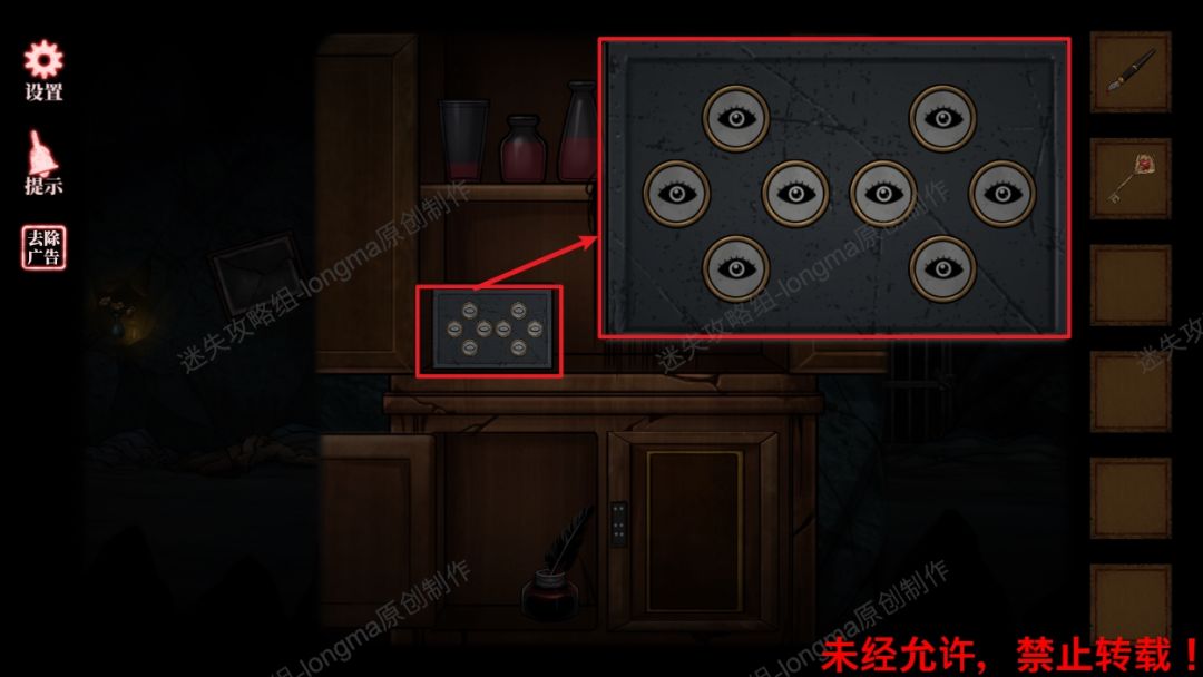 10.查看柜子中间箱子,完成小游戏打开箱子(纯手速游戏,快速的点击睁眼的圆点),获得【不规则的纸片】。10