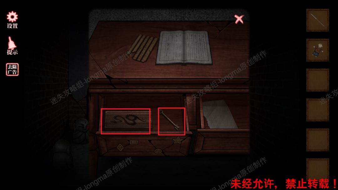 40.查看梳妆台右边的线索纸,对照线索纸下面扇子的位置转动左边盒子,打开盒子获得【一个木牌】。40