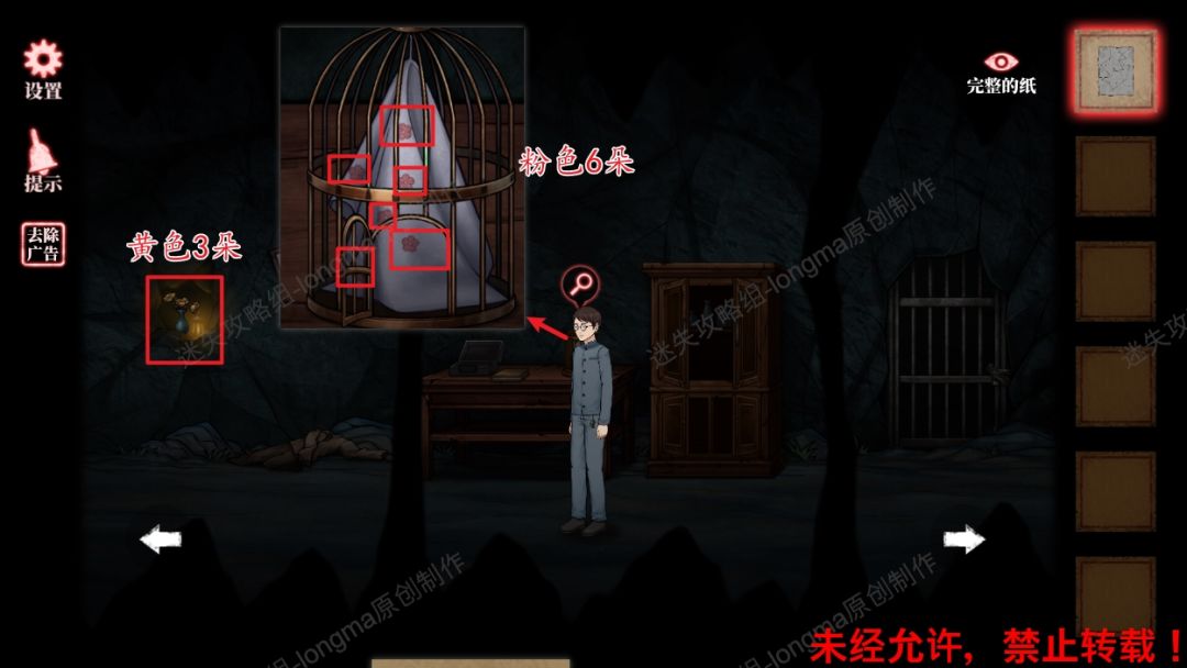 15.查看桌子上鸟笼中的丝巾,记住上面的粉色花朵数量“6”,查看最左边灯光中的花朵数量黄色“3”朵。15