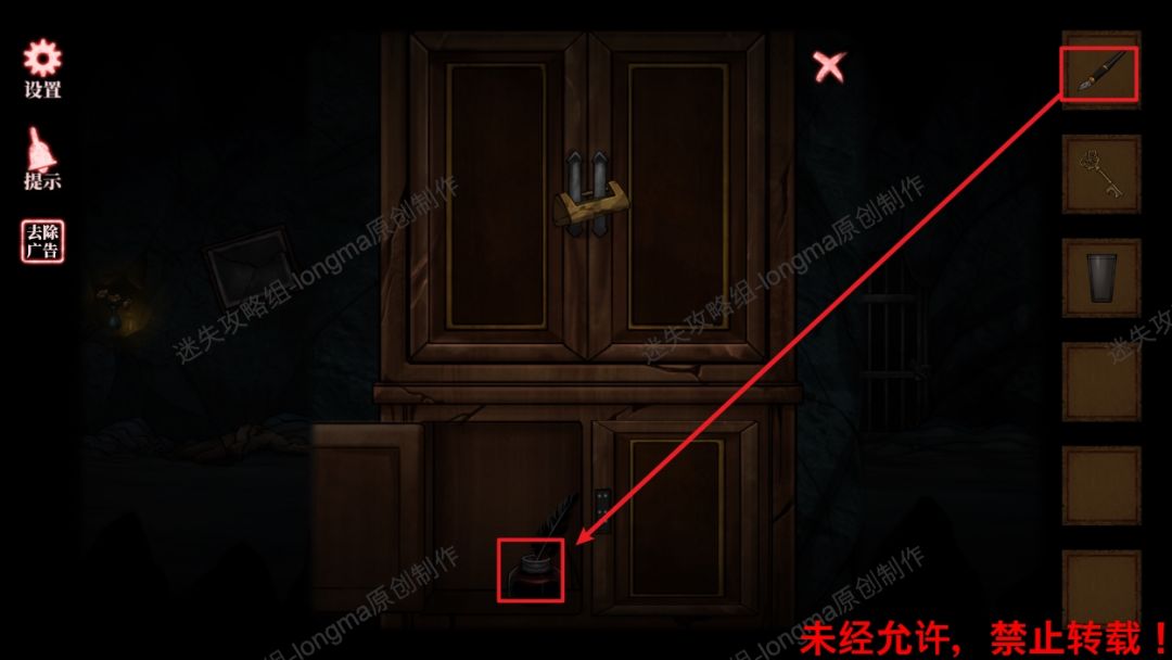 7.继续向右走,查看柜子,以相框背面图案对照笔记最后一页的颜色,调整柜子下面左边柜门锁,打开左下柜子,获得【钥匙】【杯子】,用【没墨的钢笔】获取墨水获得【有墨的钢笔】。7 7.1
