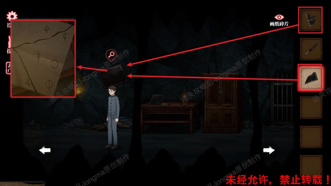 4.查看桌子上的盒子,完成拼图小游戏(将有符文的方框移动至对应的符文标记上),获得第二块【画纸碎片】。4