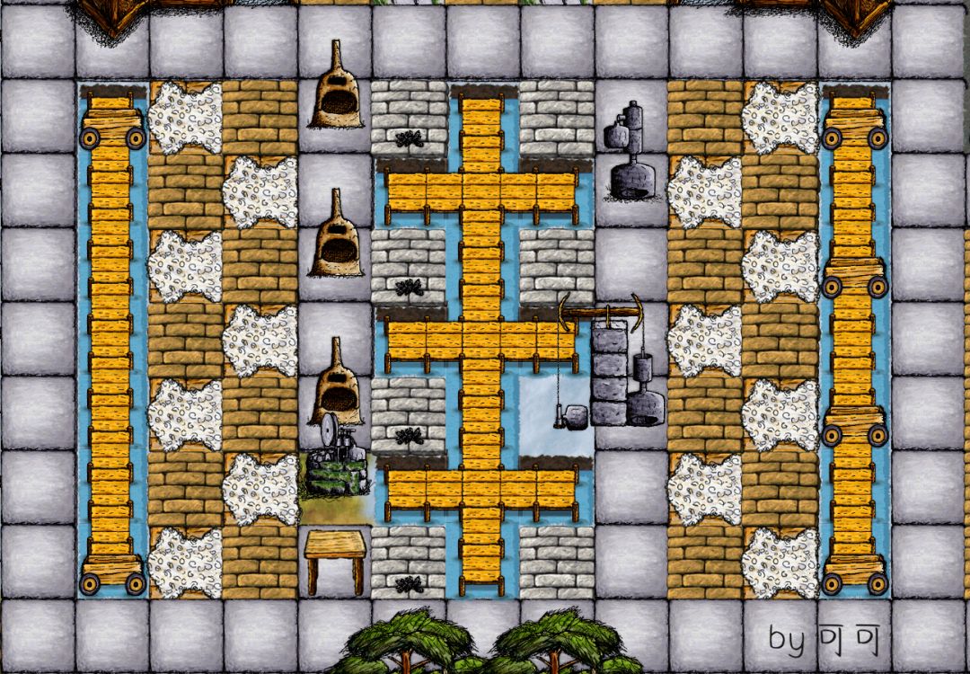 局部详介:①左上/下箱子放钢斧、擦过油的火炬棒、打火石、木棍;②小桌子放水桶;③中间存炭;