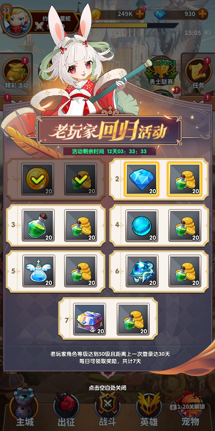 老玩家回归活动:老玩家到达50级且30天没登录触发