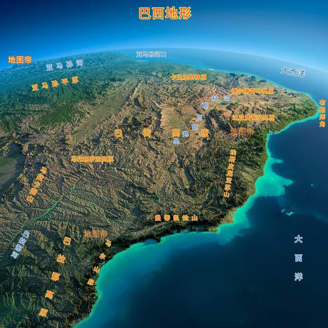 巴西高原地表起伏平缓,海拔在300~1500米之间,地势南高北低,经过长期的侵蚀和准平原化过程,形成了现今波状起伏的高原。高原的边缘普遍形成了缓急不等的山崖陡坡,高原上的河流则形成了瀑布或急流,并切割成峡谷。
