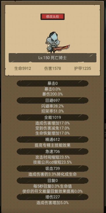 然后泰坦通关几次,更新了下装备,继续尝试开冠军试炼。下图是开荒完泰坦以及打完冠军后的属性图。这两个本当前阶段都是可以无压力通,偶尔脸黑可能死两次。