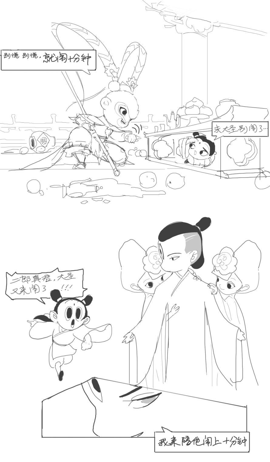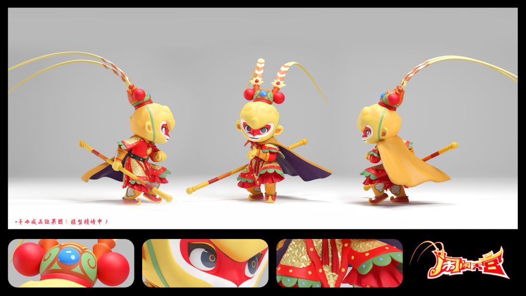 首先,闹闹是一款美术立项的产品,定位是民族国漫。从最早范本《功夫熊猫》、《疯狂动物城》等美式卡通,逐渐往中国传统的艺术风格去寻求突破,最后在《大闹天宫》、《天书奇谭》等经典动画片里面找到了灵感,也就有了大圣的红色脸蛋。在服饰上,我们参考还原了1986年版电视剧《西游记》孙悟空的设定。