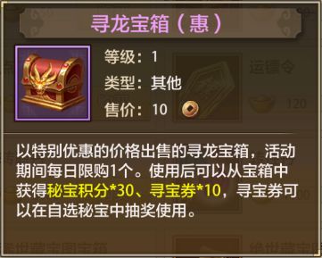 活动期间,侠士可在商城购入三种类型的“寻龙宝箱”;开启不同的寻龙宝箱可获得的寻宝券和秘宝积分数量不同;特惠折扣限时限量详情如下~