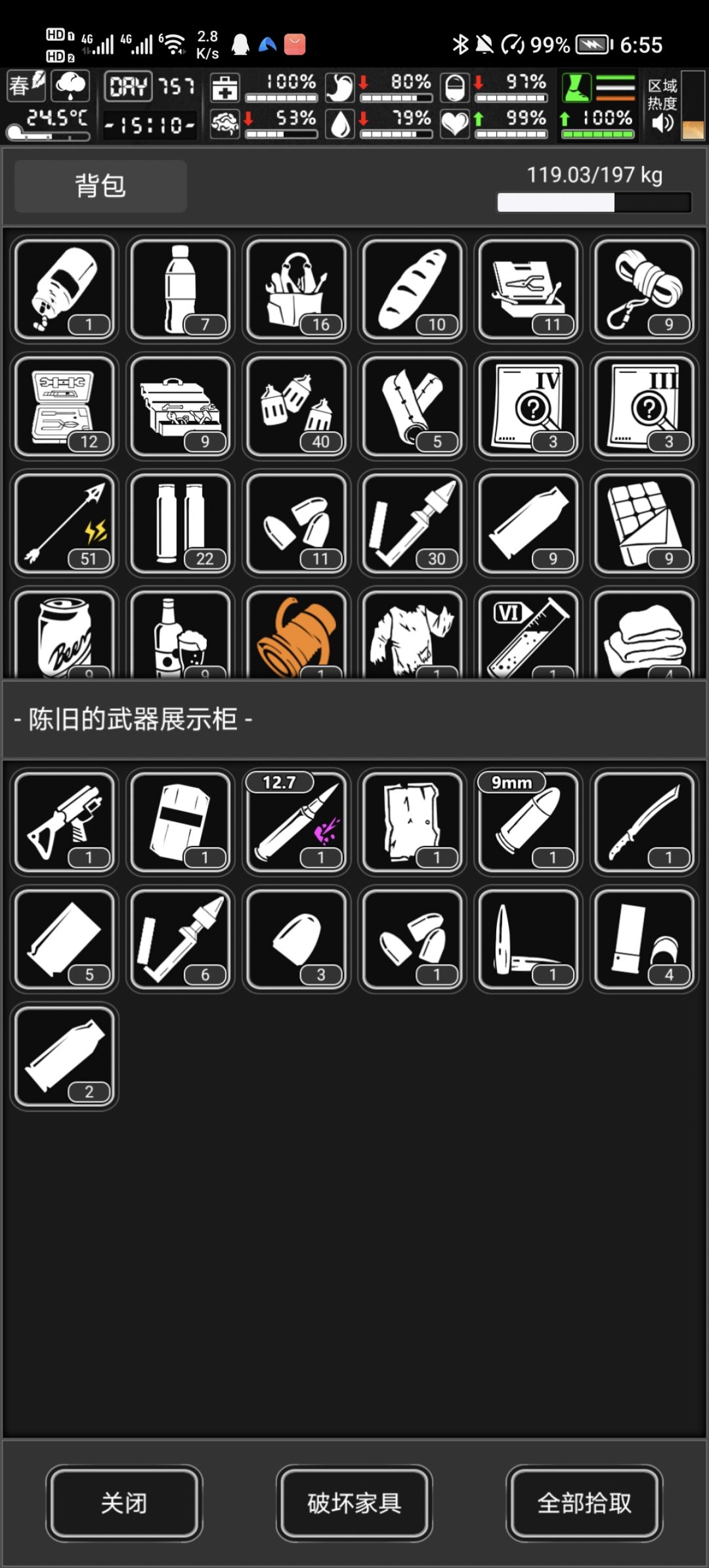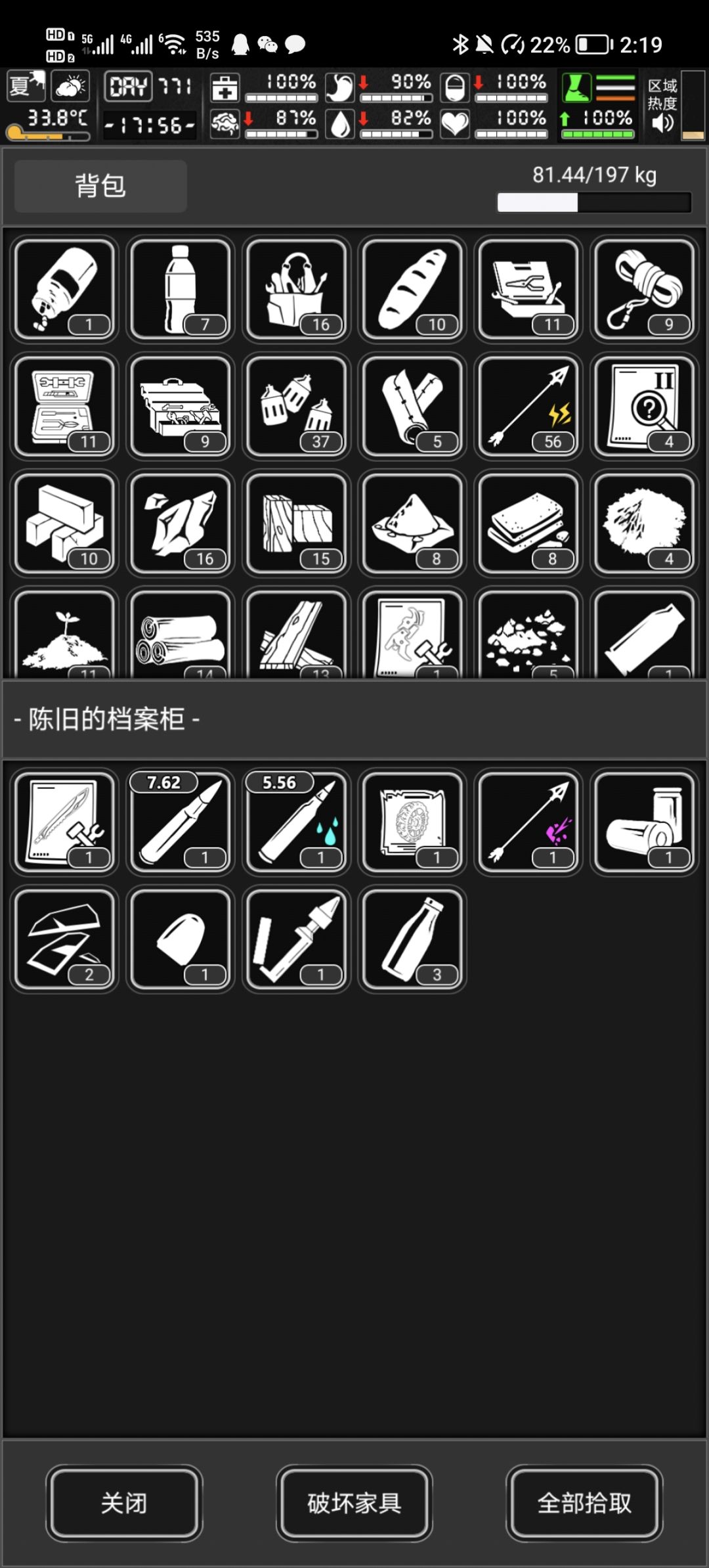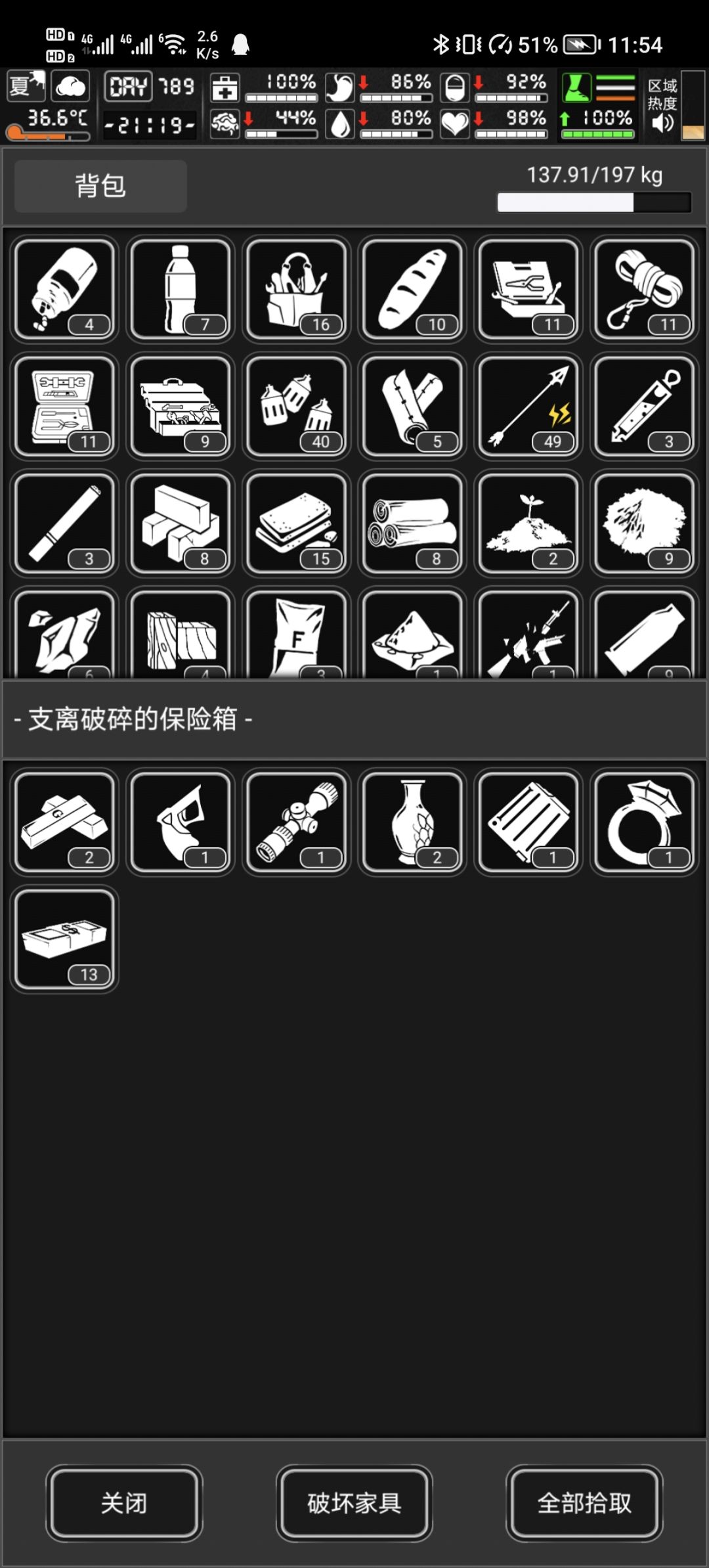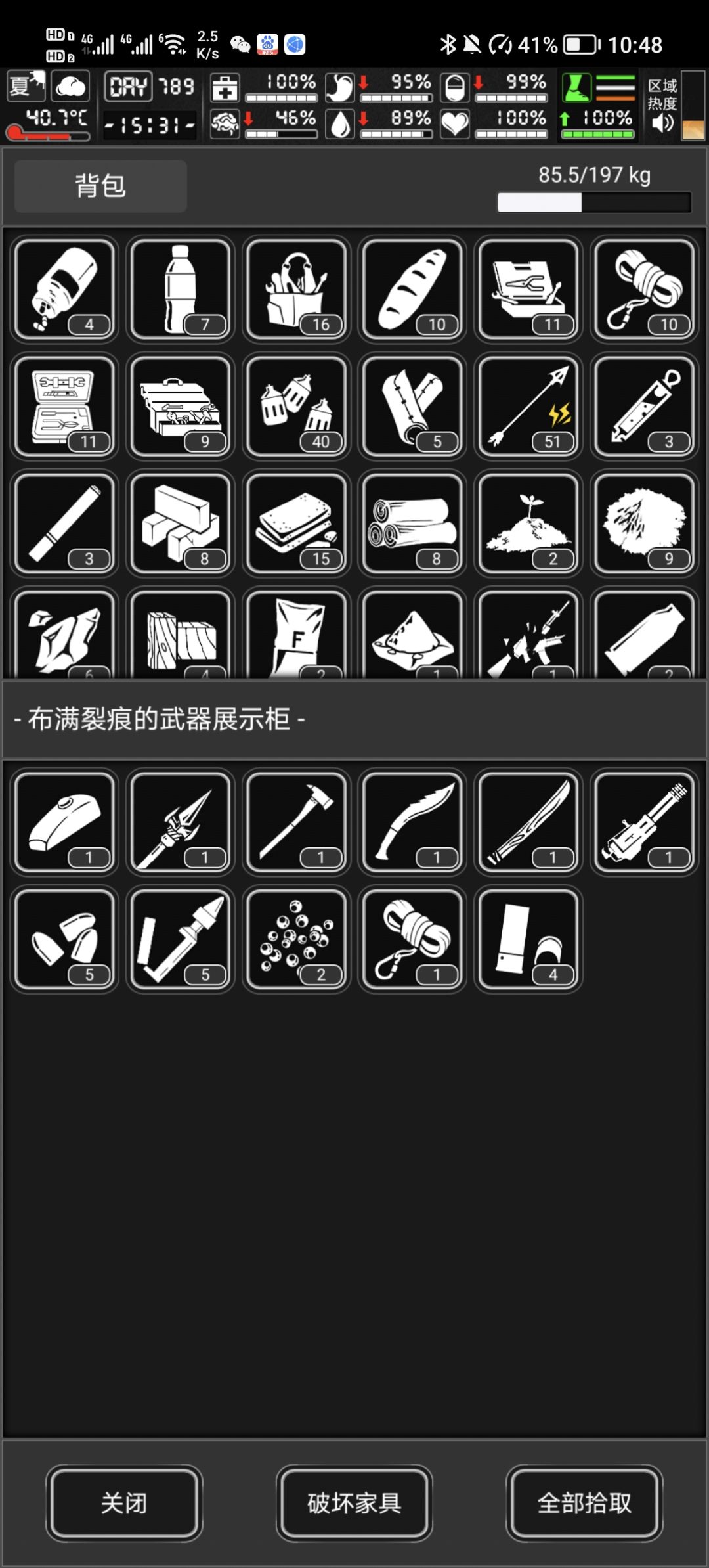 还有一点是,出货的物资是取决于最后一次开锁(就是说,如果你开锁中途被打断,会影响你的物资)打个比方,你开一个49秒的武器柜,被一只怪或者拉肚子打断了(突发事件也会)剩下7秒,开的东西就是7秒锁(所以在噪音高的时候先睡一会儿再开锁)