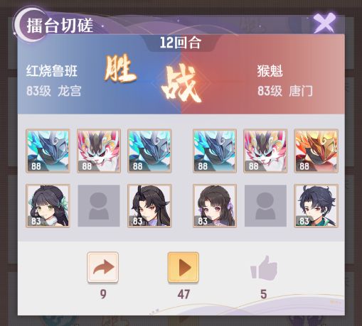 首回合黄方块队唐门飞身上马,骑乘谛听干脆利落地将对战方鬼将斩杀!两只望月与梦姑合力使青丘倒地;后续观战方以青丘为突破口一边守尸一边打出群伤压低对战方血线,最后召唤出感知宠带走隐身雨师,8回合迅速拿下胜利!