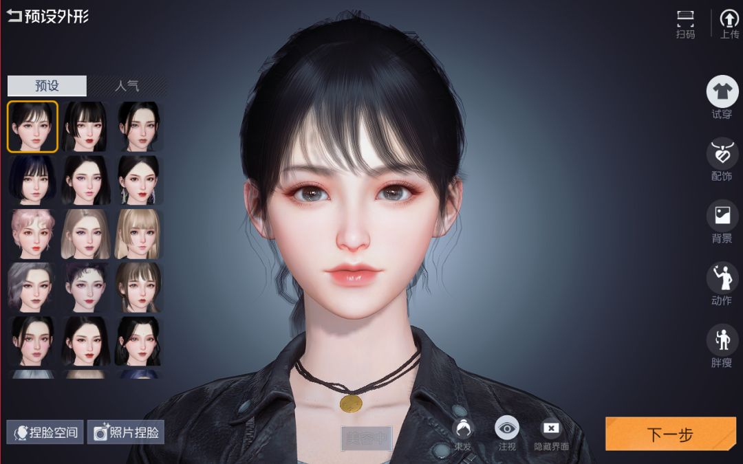 通过左下角的照片捏脸功能,然后选择一张自己最中意的照片或者喜欢的人物的正脸照片,在导入游戏中之后,系统就会自动根据照片的相貌自动捏脸了。