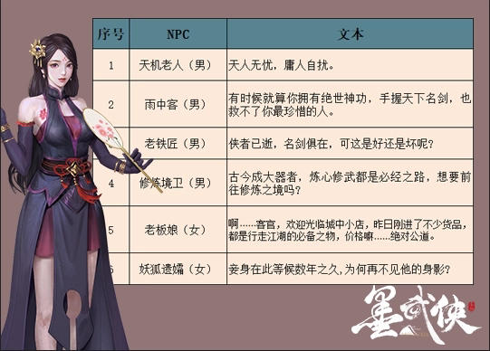 小师妹从策划部要来了游戏内6个NPC的对话文本,保证每句话都是在游戏内展示的真实文本哦~各位少侠可以自行选择喜欢的句子,录制音频后发送给我们,小师妹评选过后,最为优秀的那位少侠录制的语音会在游戏中被NPC使用哦~没听错!各位少侠有机会在游戏中听到自己的声音!这么一说是不是就已经开始兴奋起来了呢!心动不如行动,赶快参与起来吧!
