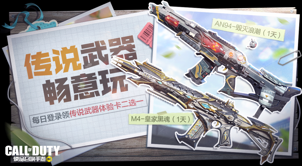 ●【传说武器畅意玩】惊喜上线,AN94-毁灭浪潮、M4-皇家黑魂体验卡二选一;