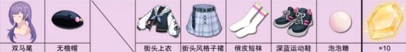 双马尾、无檐帽、街头上衣、街头风格子裙、俏皮短袜、深蓝运动鞋、泡泡糖