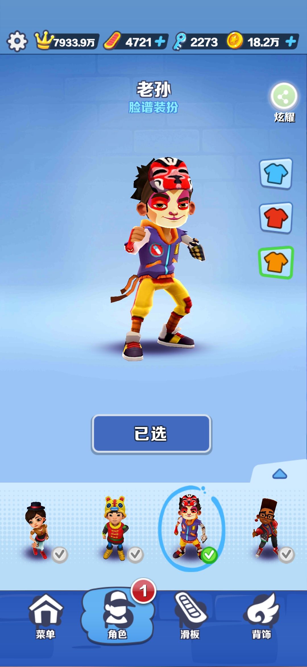 人物滑板推荐选择带有5倍得分和超级跳跃的,就拿作者小编来说吧,选择的是老孙和他的搭配滑板筋斗云,各位地铁跑酷的小伙伴们也可以选择其他人物滑板搭配5倍得分和超级跳跃的套装哦!